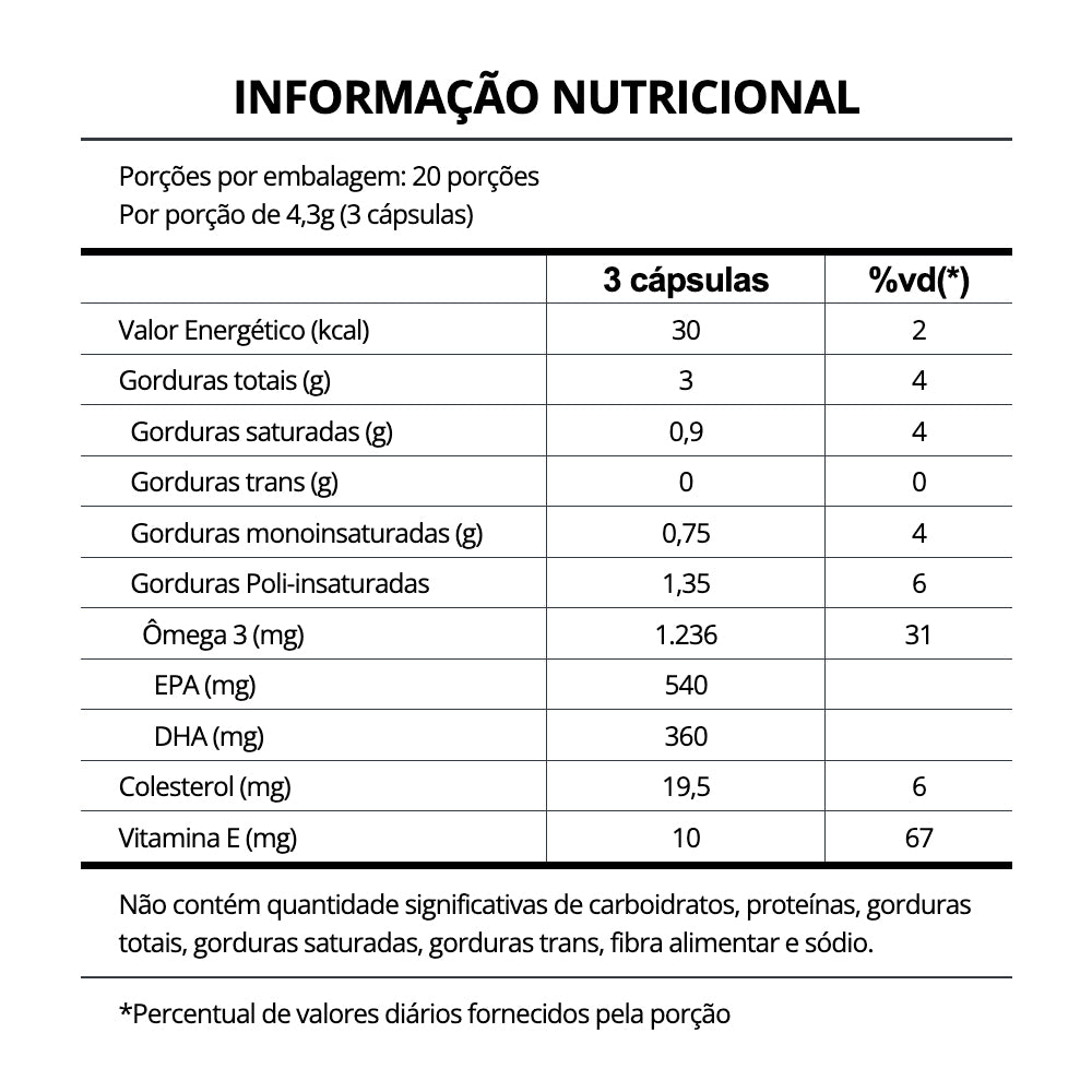 INGREDIENTES: Óleo de peixe (Ômega 3), vitamina E. Composição da cápsula: Gelatina, água purificada e umectante glicerina.